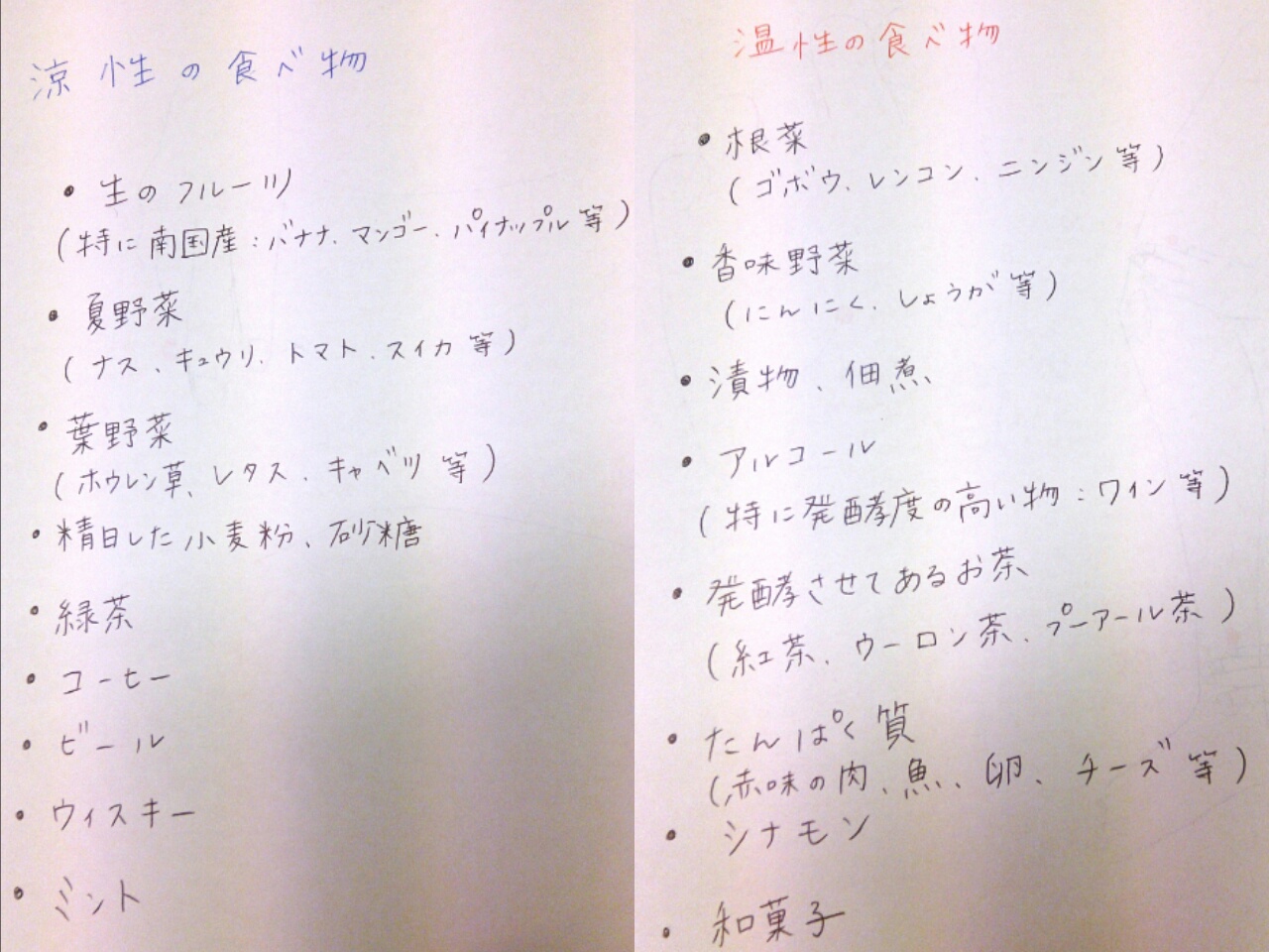 食べ物には体を冷やす「涼性」のものと、体を温める「温性」のものがあります。