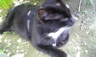 写真の黒猫は喉の下あたりに白く三日月模様があるのでツキノワグマ?みたいだから『クマ』